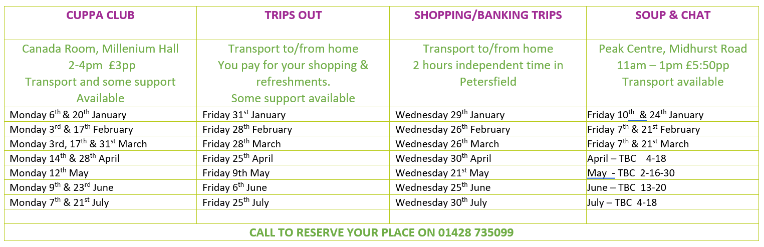 We provide a fully funded 8 seat minibus to local age related charities, join in the fun at our Cuppa Club on Monday afternoons, trips out to garden centres & pub lunches.